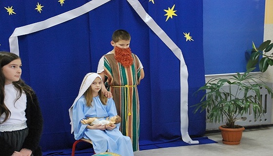 W świąteczną atmosferę wprowadzili nas uczniowie klasy III, którzy przygotowali przedstawienie jasełkowe. Zaprezentowali je 22 grudnia, przypominając w ten sposób wydarzenia sprzed ponad dwóch tysięcy lat, kiedy to w Betlejem narodziło się Boże Dzieciątko. Uroku inscenizacji dodały kolędy w wykonaniu ucznia kl. VI Damiana Przewodowskiego oraz uczennic klas IV i V Weroniki Mydło, Kingi Górskiej, Karoliny Czajkowskiej, Patrycji Kempa, Patrycji Block, Oli Drężek, które napełniły wszystkich świąteczną radością i sprawiły, że poczuliśmy magię zbliżających się świąt. Do wspólnego kolędowania włączyli się uczniowie, nauczyciele, rodzice.