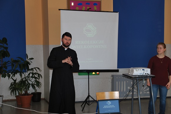 Uczniowie po wprowadzeniu w tajemnicę męki Pana Jezusa udali się do parafialnego kościoła, gdzie odprawili specjalnie przygotowaną i poprowadzoną przez Patrycję Block i Karola Godzinę Drogę Krzyżową, przystąpili do Sakramentu Pokuty oraz wysłuchali krótkiej konferencji wygłoszonej przez księdza rekolekcjonistę ks. mgr lic. Karola Gresik – kapelana Szpitala Miejskiego w Olsztynie. Na koniec tej części naszych rekolekcji Wiktoria Szczerbal podziękowała ks. rekolekcjoniście za skierowane do uczniów i nauczycieli słowa wręczając upominek.