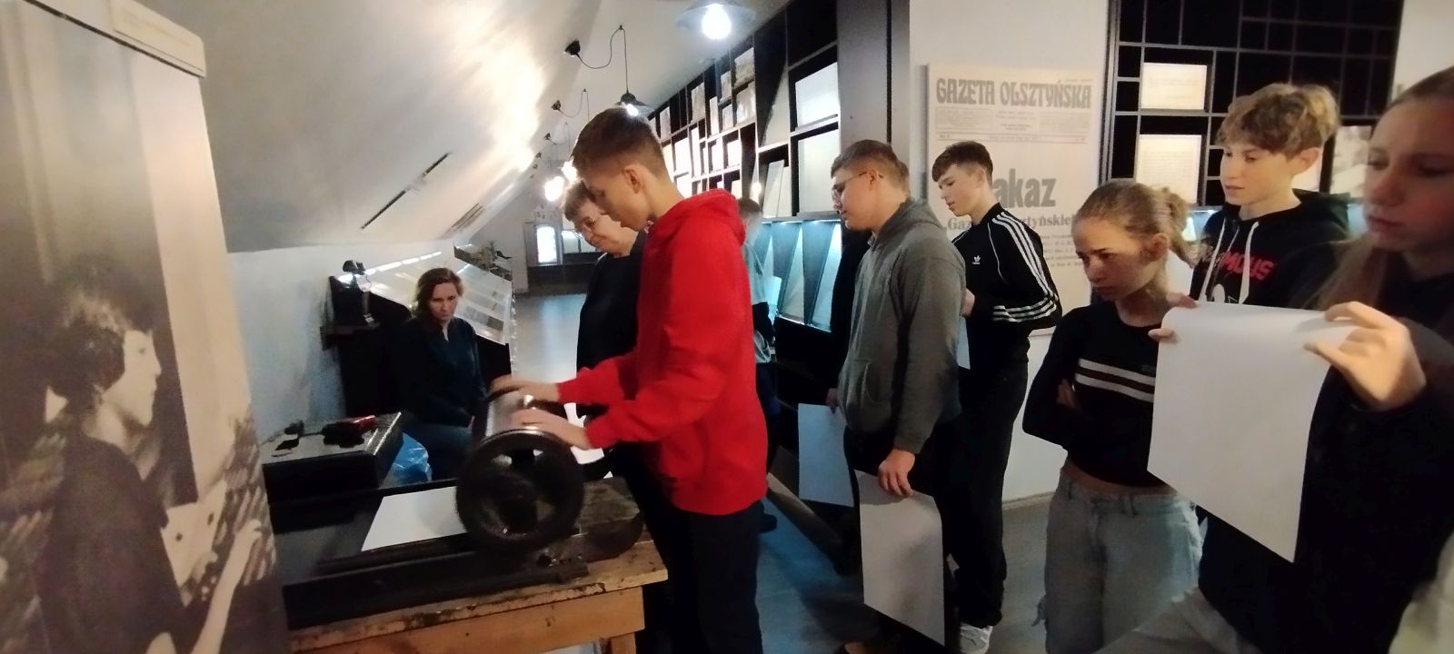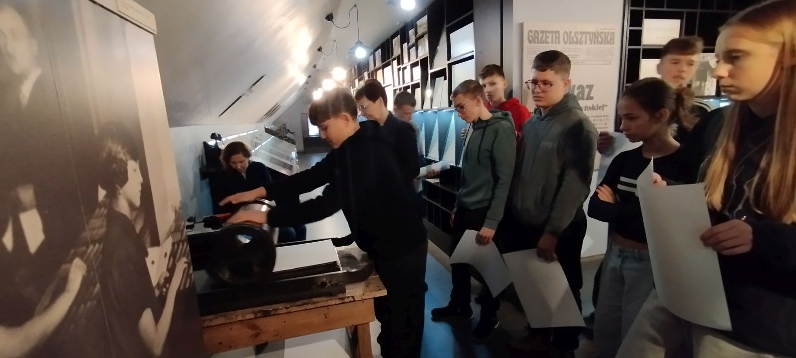 Podczas pobytu w muzeum uczniowie poznali dzieje fotografii oraz tajniki pracy fotografów w XIX i XX wieku. Zwiedzili także wystawy ukazujące historię Olsztyna oraz działalność „Gazety Olsztyńskiej”. Jednym z najbardziej niezwykłych punktów wizyty była możliwość skorzystania z dawnej maszyny drukarskiej. Pani Kinga Raińska – kustosz muzeum zaproponowała, aby każdy z uczestników wycieczki samodzielnie wydrukował archiwalny egzemplarz pierwszego numeru „Gazety Olsztyńskiej” z 1886 roku.